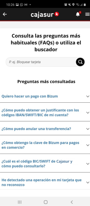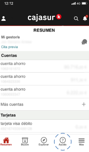 1 Accede desde el menú al pie a Ayuda, si tienes dudas puedes llamar a nuestros teléfonos o consultar ayuda online. Pulsa «Ayuda».